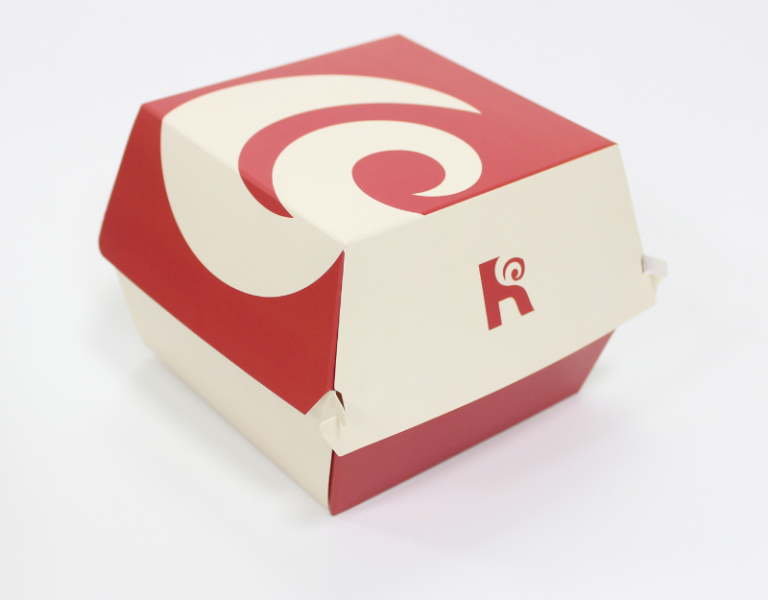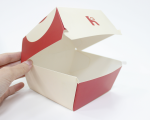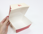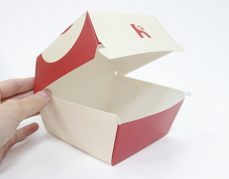 Hộp giấy được phát triển theo dạng gập, có nắp đậy chắc chắn, phù hợp với các sản phẩm burger và đồ ăn nhanh. Thiết kế khóa gài đơn giản nhưng hiệu quả, giúp hộp đóng mở nhanh chóng, hạn chế việc bung nắp khi vận chuyển. Đặc biệt, cấu trúc hộp được tối ưu để dễ xếp chồng, thuận tiện cho cả khâu bảo quản và phục vụ.