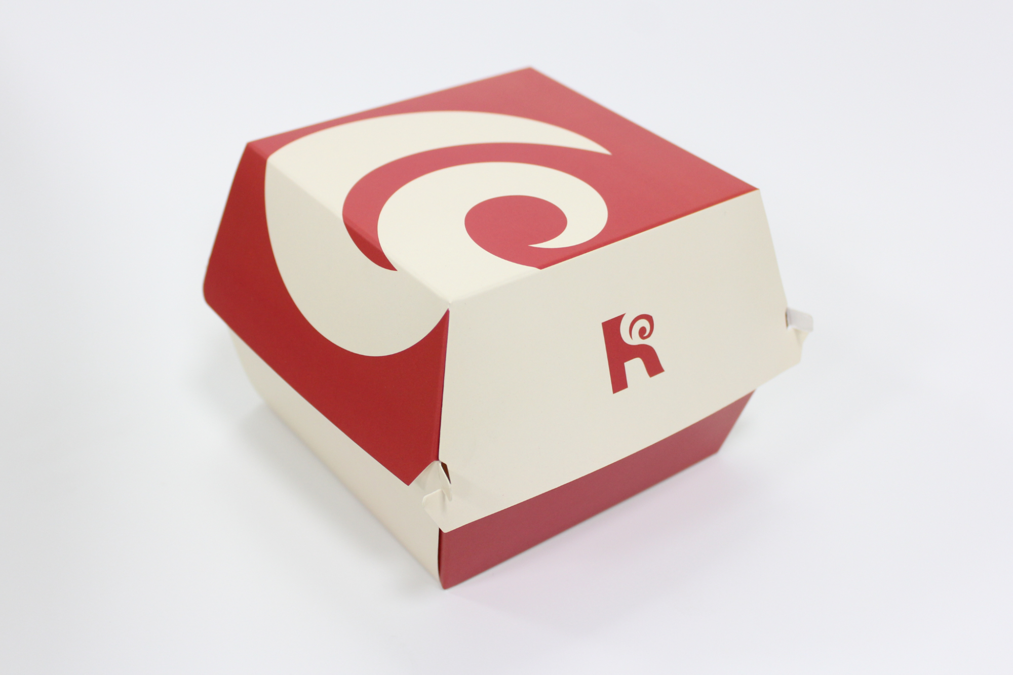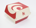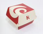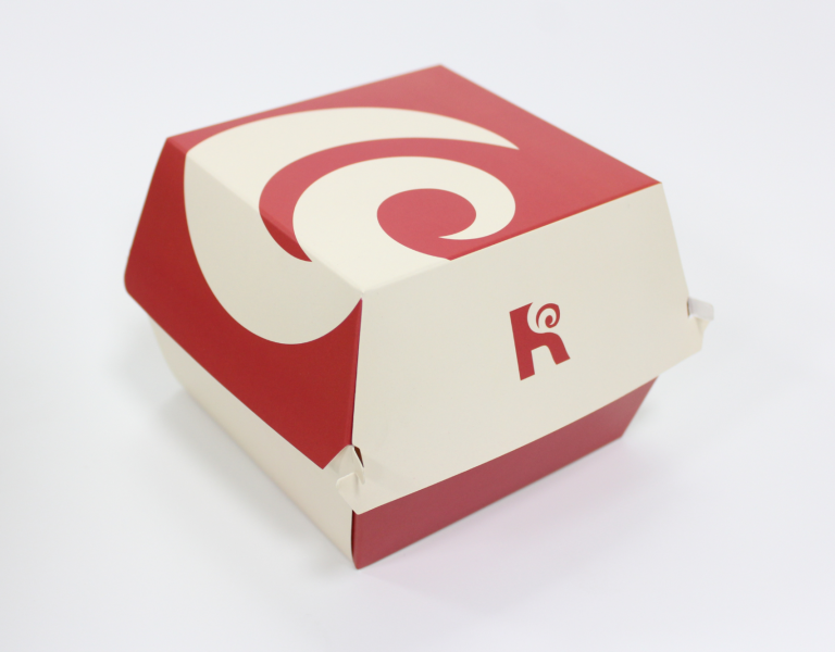 Gam màu đỏ - trắng đặc trưng của Reds' Burger được khai thác triệt để, kết hợp cùng họa tiết xoáy đầy năng lượng, gợi liên tưởng đến sự bùng nổ hương vị. Logo được đặt ở mặt trước hộp, vừa tinh giản vừa đủ sức ghi dấu thương hiệu trong mắt khách hàng.