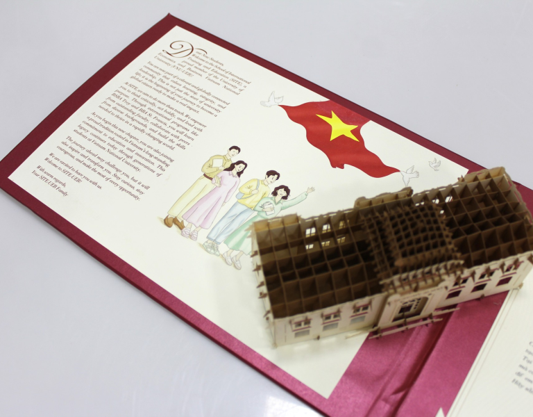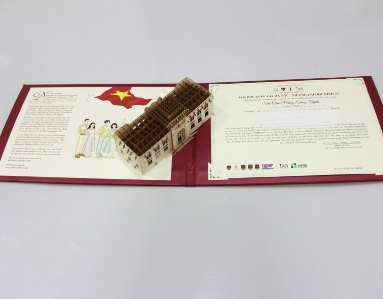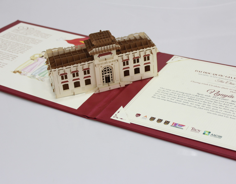 Trong dự án này, chúng tôi đã lựa chọn giấy mỹ thuật cao cấp với kỹ thuật in offset sắc nét, mang lại cảm giác sang trọng và bền đẹp. Bìa ngoài với chất liệu da ép nhũ vàng, kết hợp màu đỏ truyền thống của nhà trường, vừa nổi bật vừa trang nghiêm. Bên trong đi kèm chi tiết mô hình 3D Đại Học Tổng hợp - Di sản Văn Hóa và Tri thức của Thủ đô tạo điểm nhấn độc đáo, ấn tượng đối với người nhận.