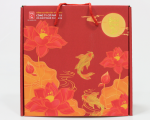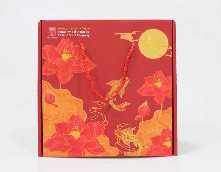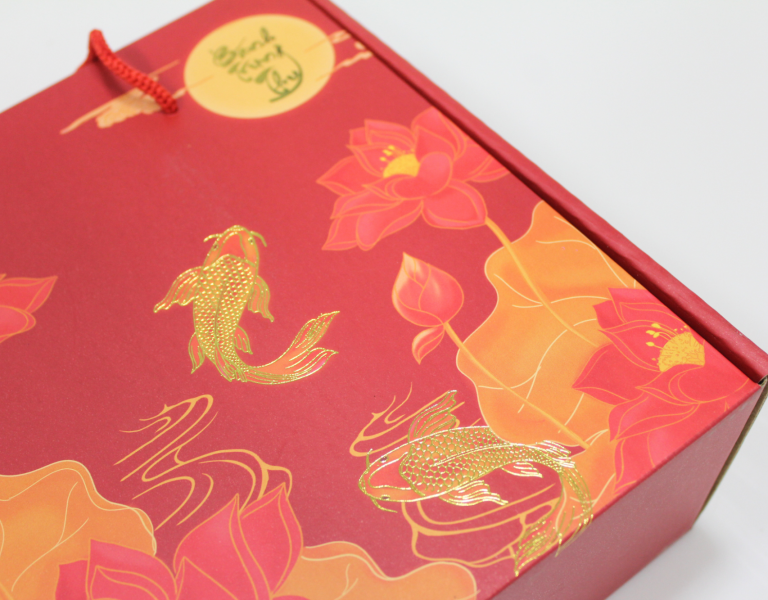 Gam màu đỏ chủ đạo – sắc màu tượng trưng cho sự may mắn, thịnh vượng – được phối cùng hình ảnh hoa sen và cá chép. Họa tiết cá chép vàng được ép nhũ nổi bật, gợi liên tưởng đến sự sung túc, bền vững và tinh thần vươn lên. Từng chi tiết in được xử lý sắc nét, tạo ấn tượng ngay từ cái nhìn đầu tiên.