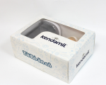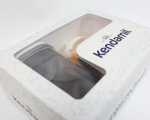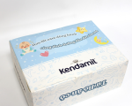 Hộp quà tặng Kendamil có cửa sổ mica trong suốt, giúp khách hàng dễ dàng nhìn thấy sản phẩm bên trong. Tone màu xanh pastel và trắng, kết hợp các họa tiết minh họa đáng yêu, khắc họa đúng tinh thần “dinh dưỡng cho bé yêu từ những ngày đầu đời”.